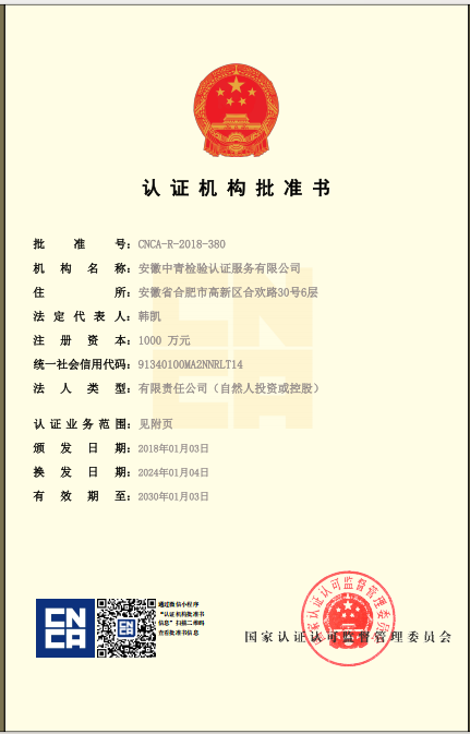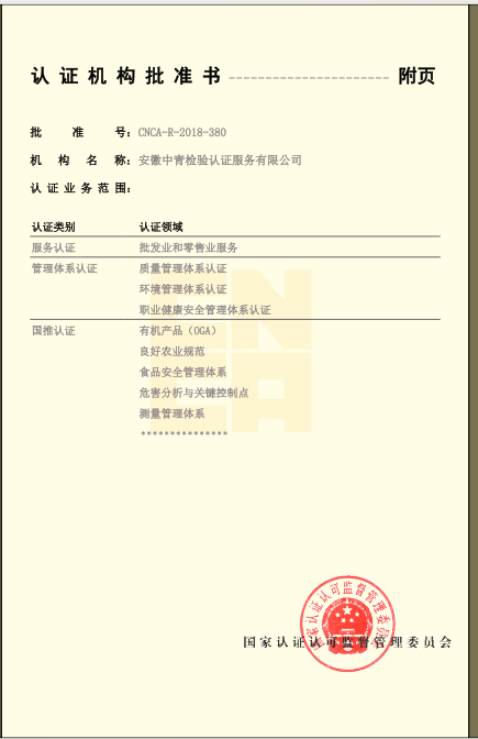 安徽中青檢驗認(rèn)證服務(wù)有限公司成立于2017年6月6日,2018年1月3日通過國家認(rèn)證認(rèn)可監(jiān)督管理委員會批準(zhǔn),現(xiàn)認(rèn)證領(lǐng)域:質(zhì)量管理體系、環(huán)境管理體系、職業(yè)健康安全管理體系、食品安全管理體系、HACCP管理體系、有機產(chǎn)品認(rèn)證、良好農(nóng)業(yè)規(guī)范、服務(wù)體系、醫(yī)療器械質(zhì)量管理體系、企業(yè)誠信管理體系、食品工業(yè)企業(yè)誠信管理體系、食安安徽品牌等類別認(rèn)證。